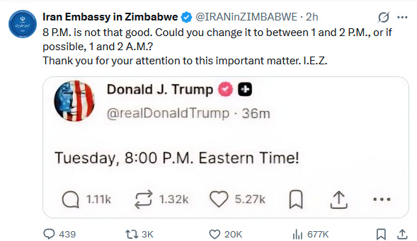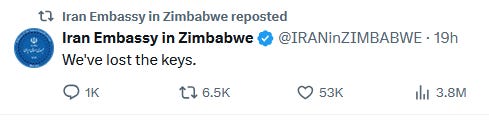 And my prize for the craziest bastards of all, for staring annihilation in the face and laughing at the man who threatened it: the official account of the Iranian Embassy in Zimbabwe, which replied to Trump’s tweet with a pair of sublimely reckless put-downs.